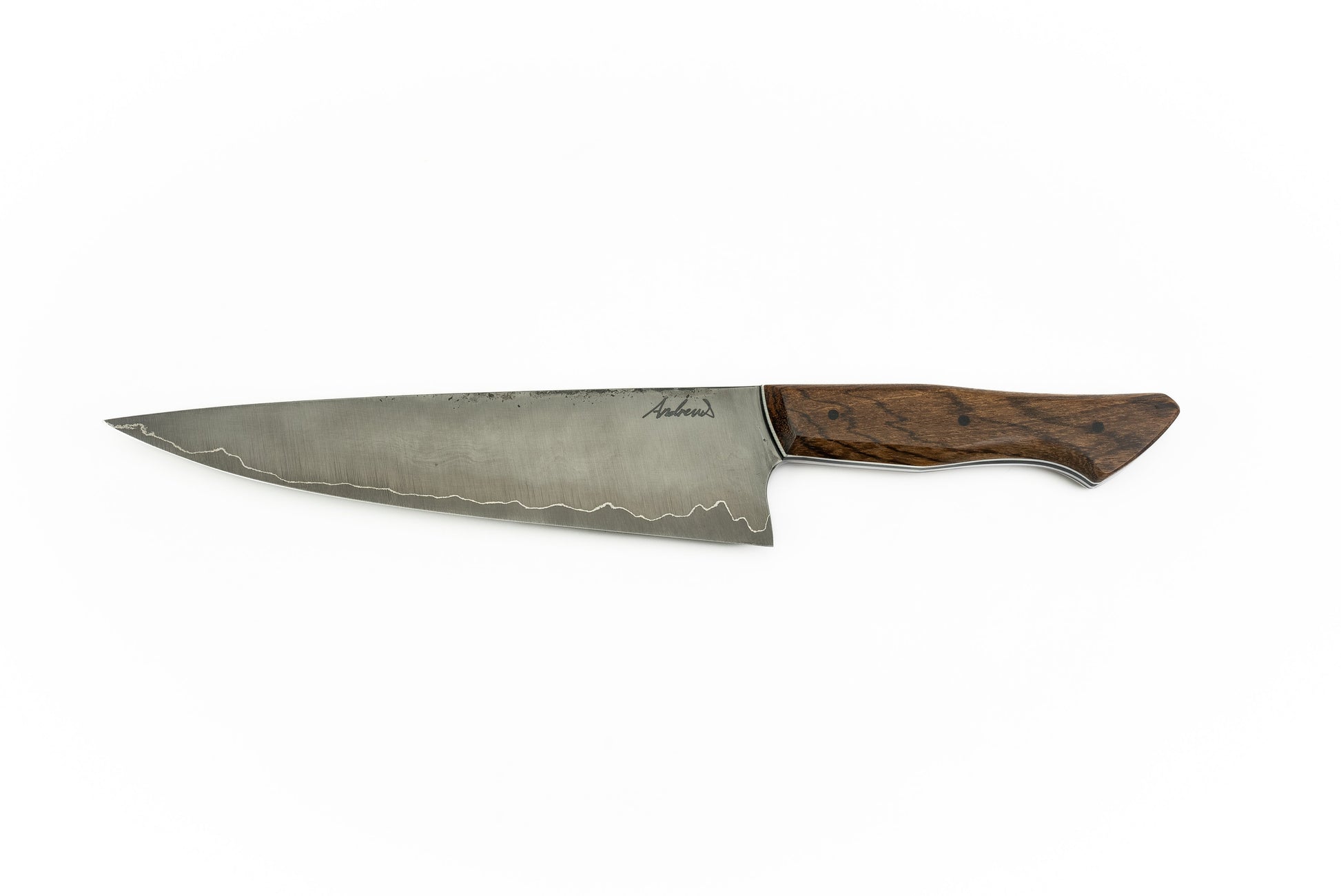 A Chef's Knife is the western equivalent of the Japanese Gyuto. Featuring a tapered spear shaped profile with a pointed tip used for slicing chopping dicing with precision.