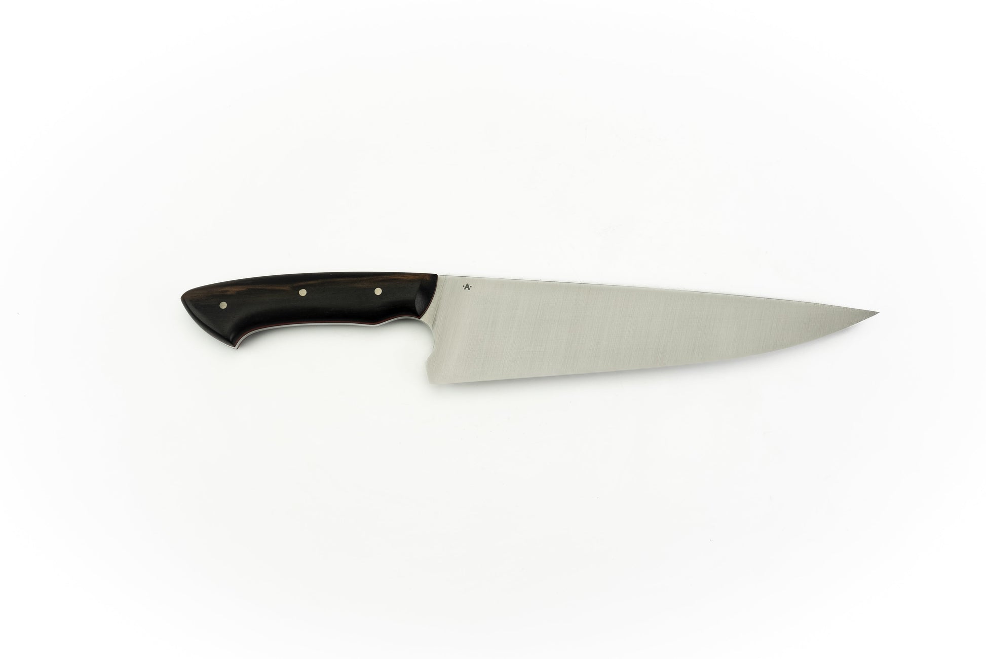 A Chef's Knife is the western equivalent of the Japanese Gyuto. Featuring a tapered spear shaped profile with a pointed tip used for slicing chopping dicing with precision.